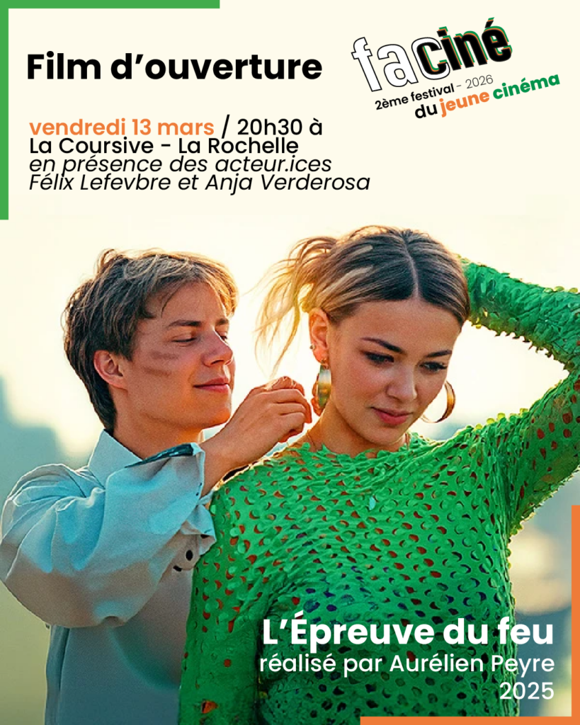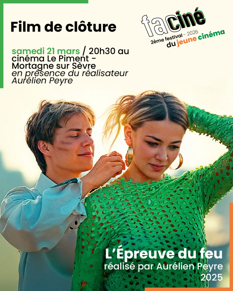 Cette année, nous avons l’honneur de projeter le film L’épreuve du feu, qui fera l’ouverture du festival à La Rochelle en présence des acteur.ices Félix Lefevbre et Anja Verderosa, ainsi que la fermeture à Mortagne sur Sèvre en présence du réalisateur Aurélien Peyre.